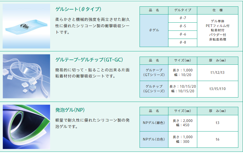 衝撃吸収の他に、防振・制振、放熱、防水・防塵、オプティカルボンディング、感触などさまざまな用途において使用されています。